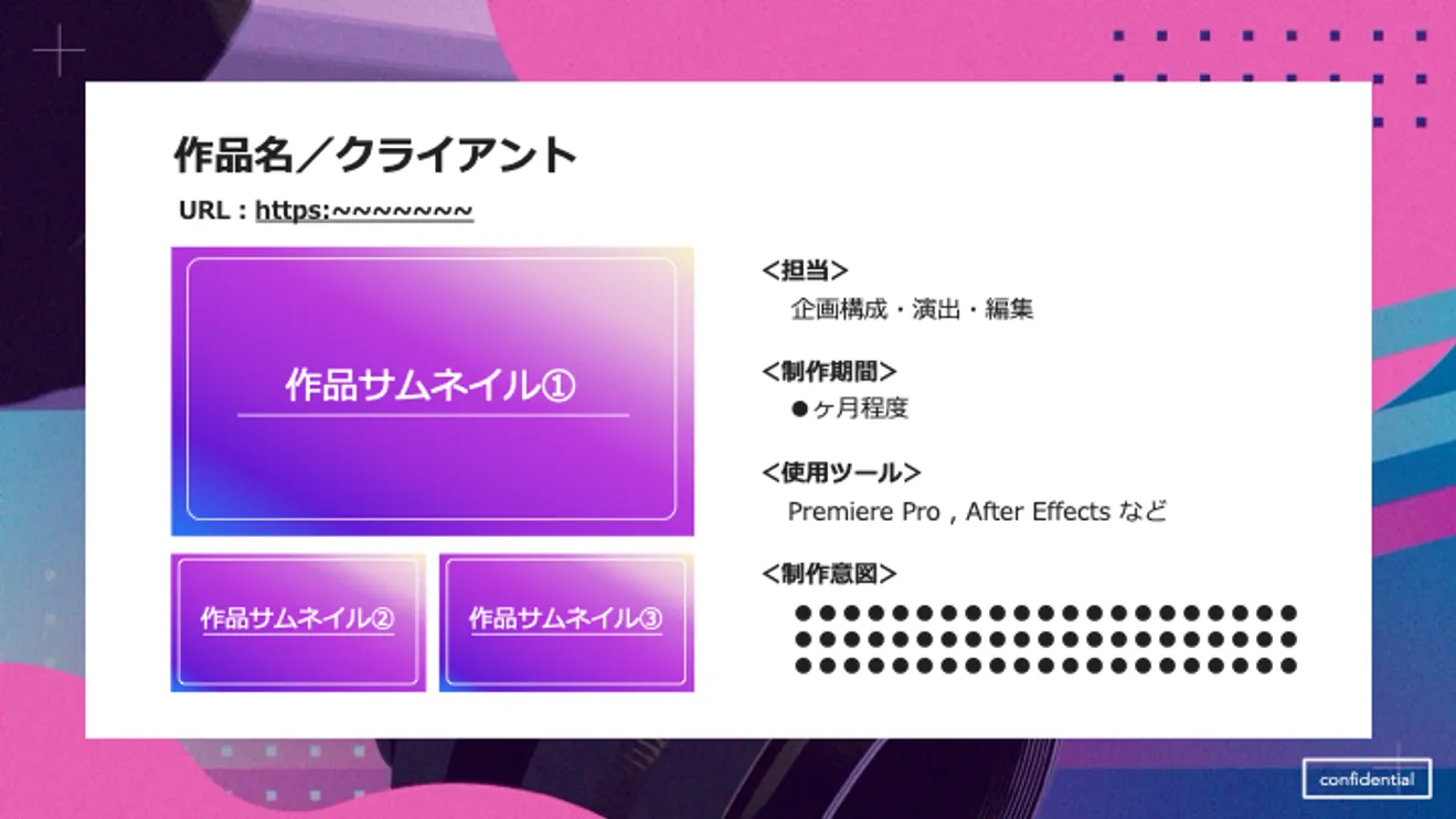 ポートフォリオ形式であれば、サムネイルを並べることで一目でどんな映像を制作してきたのかがわかるのと合わせて、担当した内容や制作にかかった期間、使用ツールや制作意図など、相手が知りたい内容をまとめて伝えることが可能です。