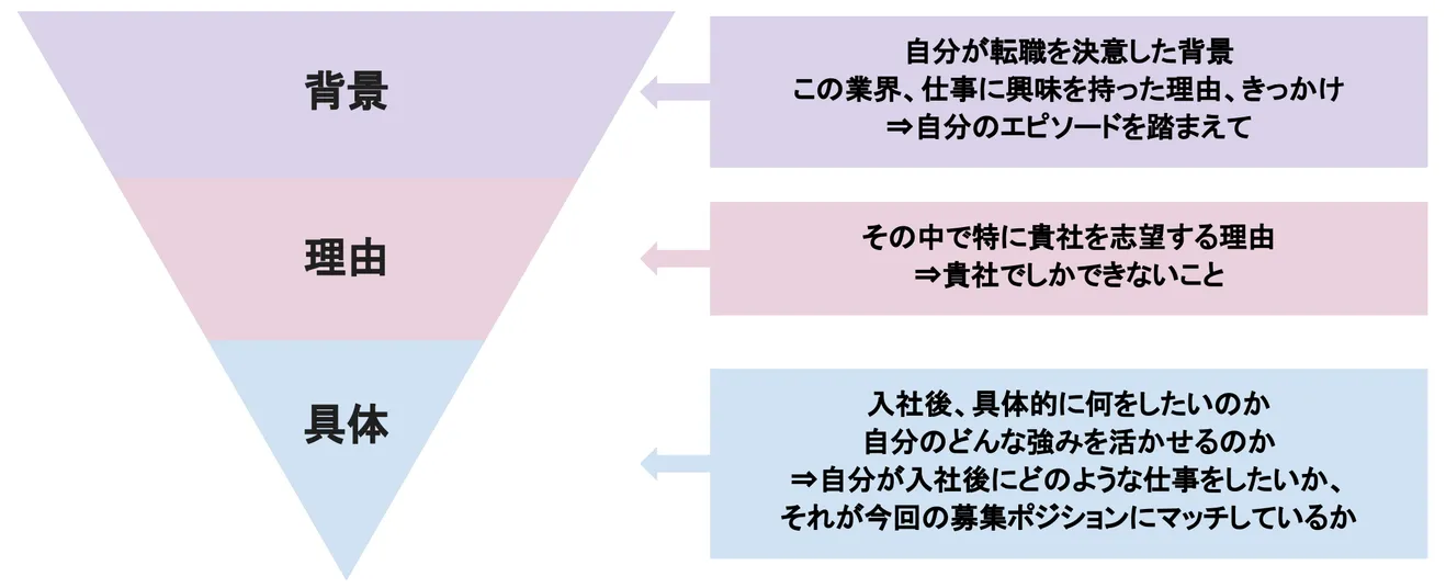 志望動機作成の際は以下のように、背景⇒理由⇒具体の順に沿ってまとめることで、読み手にとってわかりやすく説得力のある文章にすることができます。