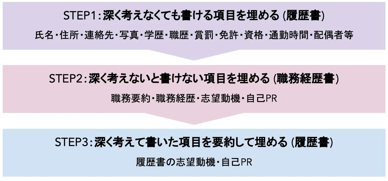 履歴書・職務経歴書を作成する際、各項目を上から順番に埋めていくよりも、以下の順番での作成をオススメしています。