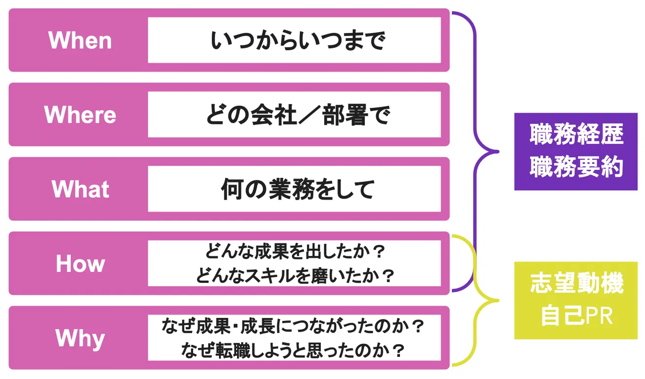 上記ポイントの揃った書類を作成するために、まずは4W1Hの観点で職務経歴書の土台となるキャリアの棚卸しから始めましょう。