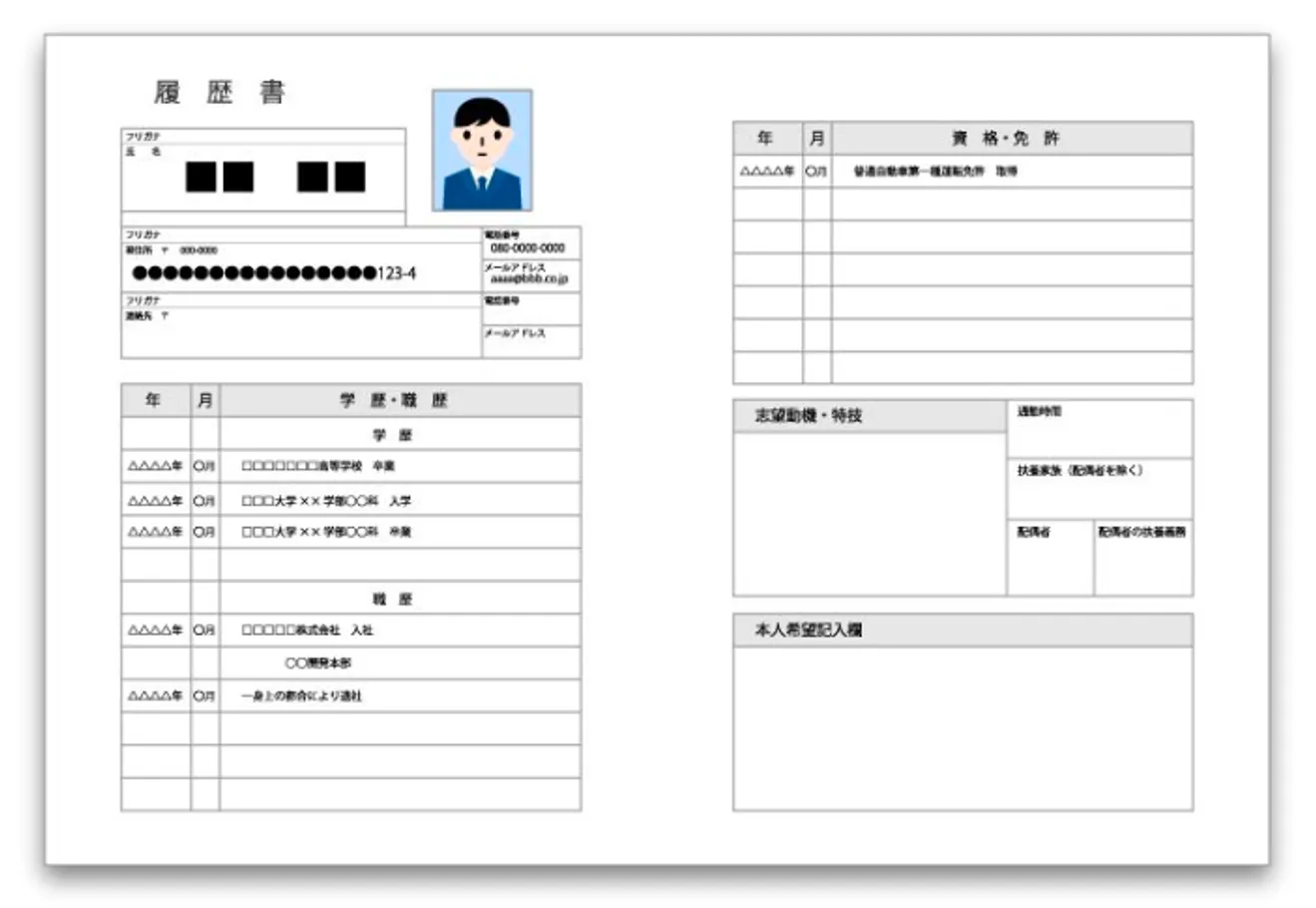 個人情報/学歴・職歴/免許・資格/志望動機/自己PR/配偶者欄/本人希望記入欄などを記載します。
